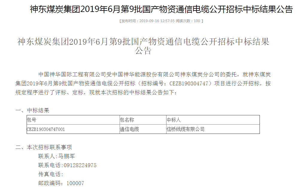 點(diǎn)擊數(shù):67812019-11-21 00:00:00 來(lái)源: 神東煤炭集團(tuán)2019年6月第9批國(guó)產(chǎn)物資通信電纜公開(kāi)招標(biāo)中標(biāo)結(jié)果公告